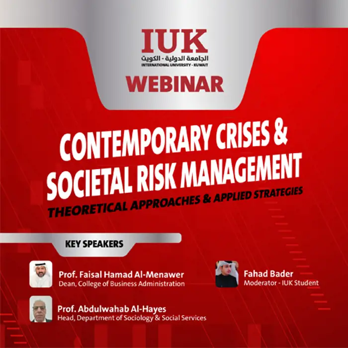 The International University of Kuwait (IUK) hosted a webinar on March 16, 2026, titled “Contemporary Crises and Societal Risk Management: Theoretical Approaches and Applied Strategies”, bringing together faculty, students, and staff. The session featured Prof. Faisal Hamad Al-Menawer and Prof. Abdulwahab Al-Hayes.